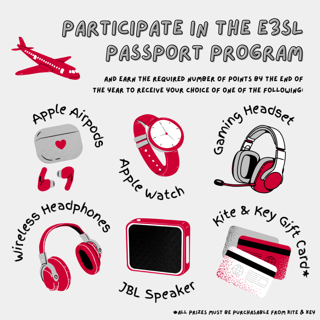 Students who remain active in the Passport Program and earn the required number of points will be recognized and will receive an incentive prize of their choice from the university’s tech store, Kite + Key!